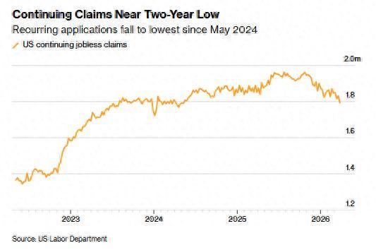 美国劳工部周四公布的数据显示,截至4月4日当周,经季节性调整后,初请失业金人数增加1.6万人,达到21.9万人,略高于经济学家预期的21万。截至3月28日当周,续请失业金人数(即首周之后仍在领取救济的人数,可作为招聘活动的替代指标)经季节性调整后减少3.8万人,降至179.4万人,为2024年5月以来的最低水平,且低于经济学家预期的184万人。